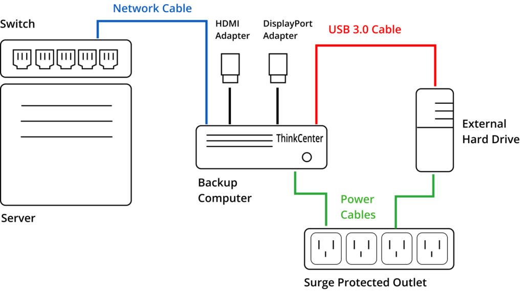 Before you begin installing any devices, you want to first locate the server and switch. Once this is located, you want to ensure there is an open port to attach the backup computer. Once this port is located, you also want to be sure there is a surge protected power source that has open outlets for both the backup computer, and the external hard drive.
